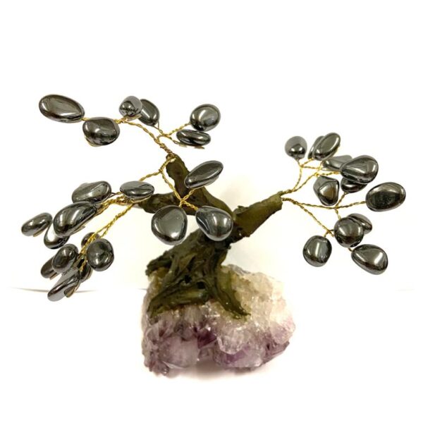A base das arvores é ametista. Peso varia entre 95gramas e 150gramas. Têm aprox 10cm de altura.